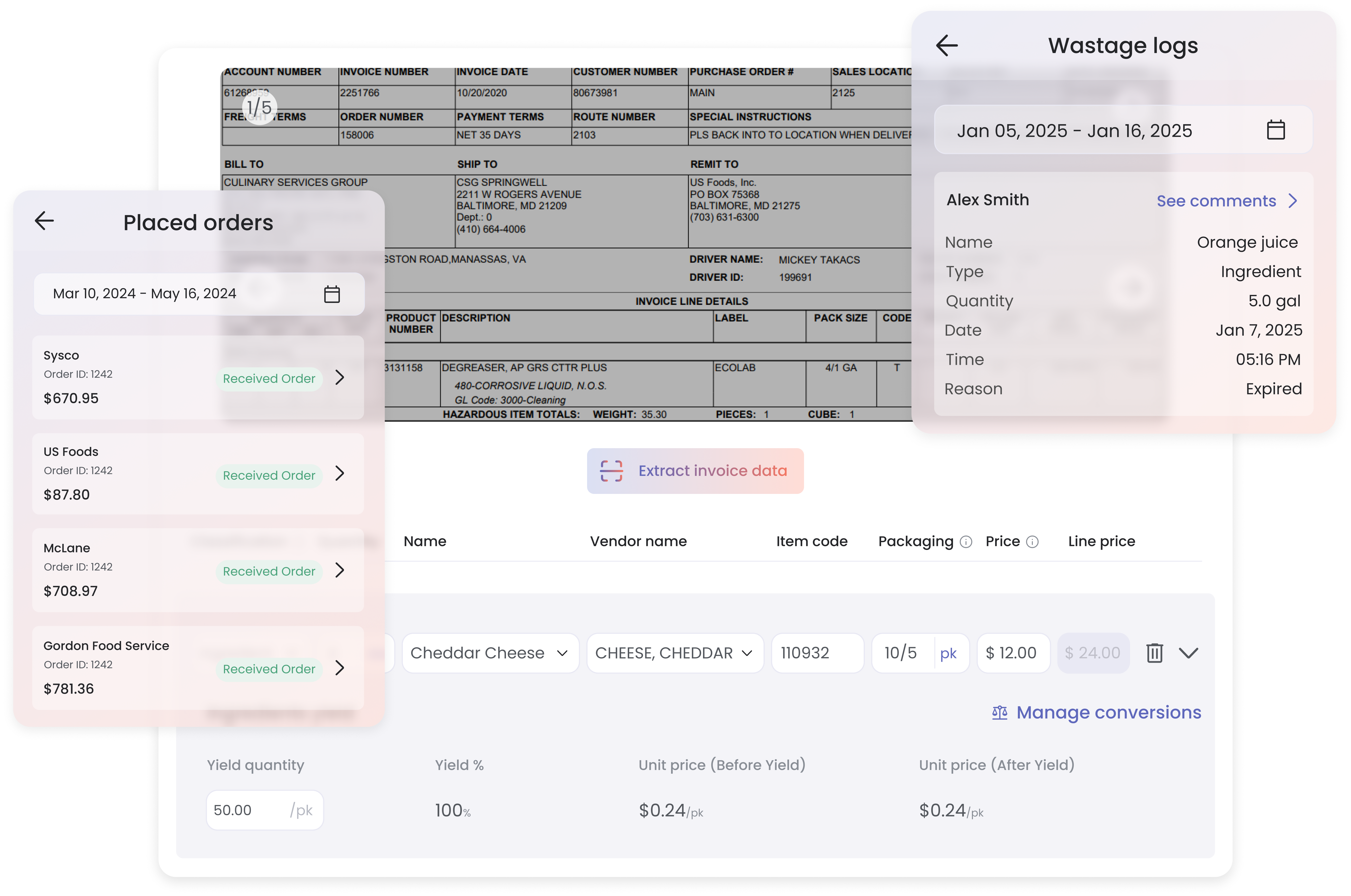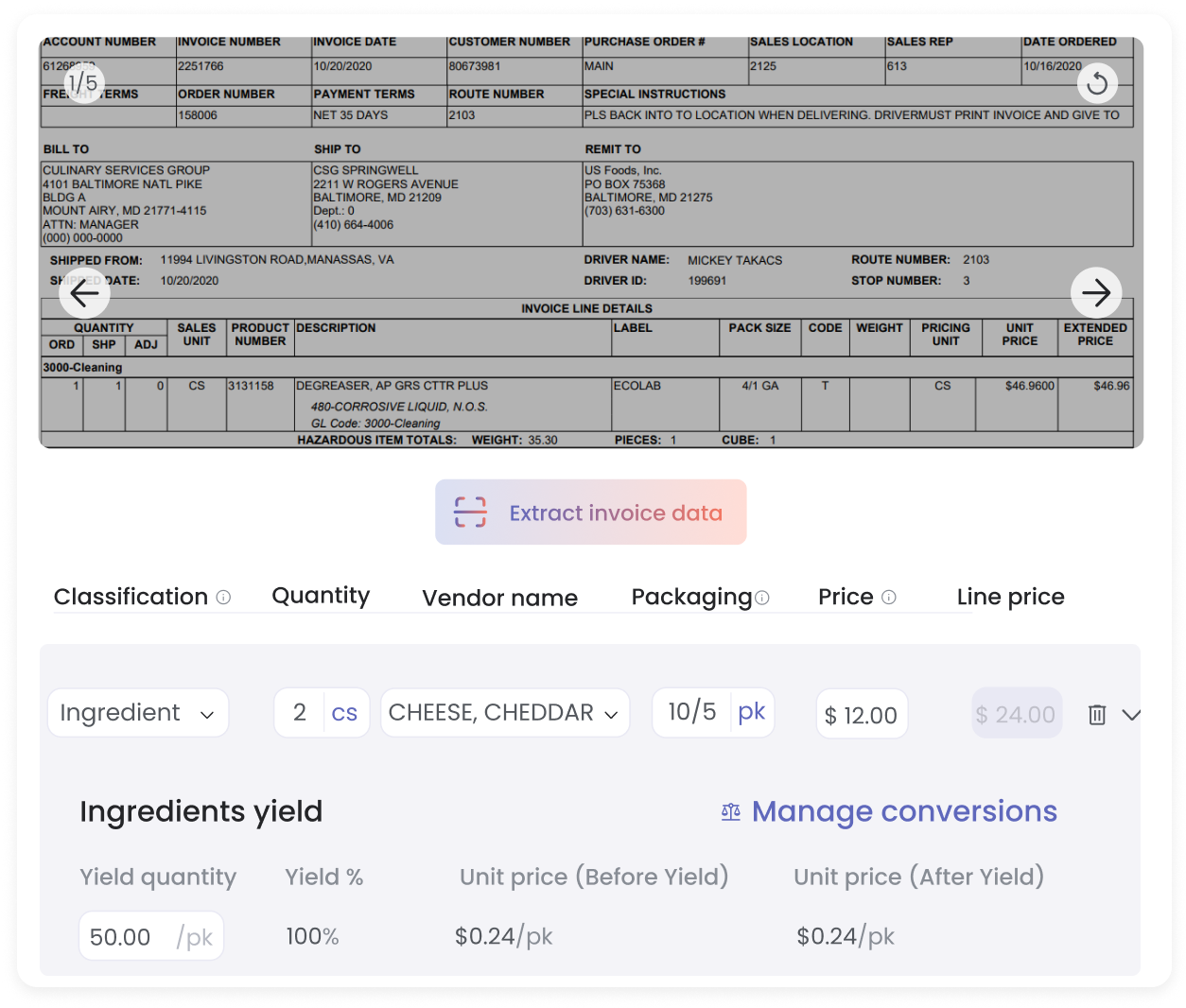 AI-driven inventory solution for restaurants with OCR invoice scanning, recipe engineering, sales forecasting and vendor price comparison